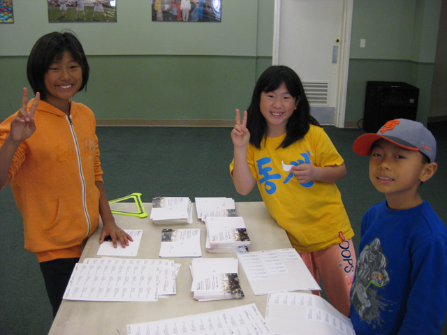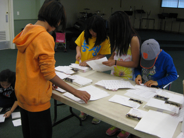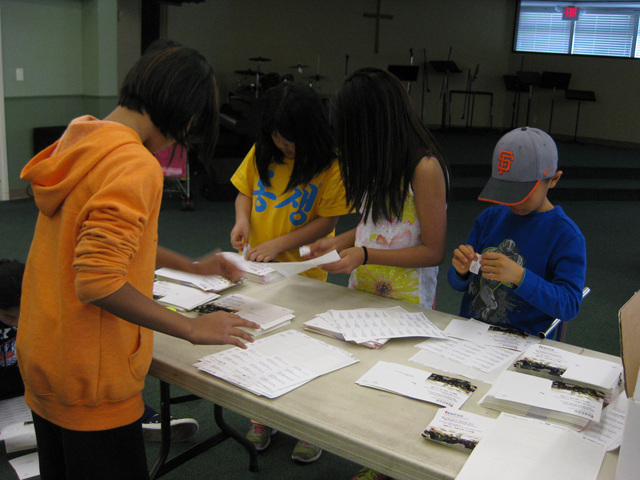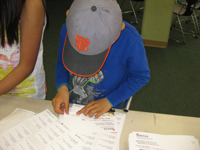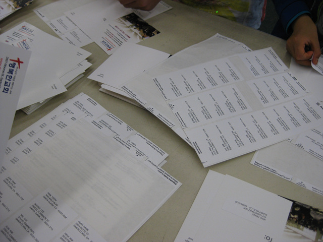 고사리 같은 손으로 라벨을 붙히는 작업을 하는 아이들과 교우들